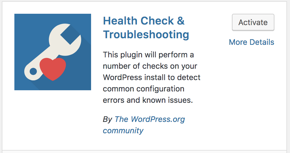This will give y'all a page of search results. The Health Check & Troubleshooting plugin should be visible now. Click the 'Install Now' button.